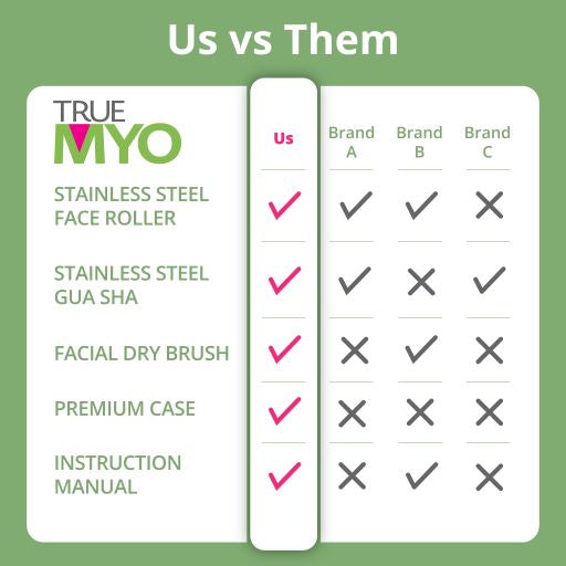 TrueMyo Facial Beauty Trifecta - Your Gua Sha facial tools kit has everything you need for healthy, glowing skin. We’ve included a facial dry brush, a micro facial gua sha tool and a facial roller. The ultimate trio of beauty tools for a fresh and fabulous face! We partnered with Myofascial Releaser, an industry leader in professional physical therapy products, to bring you the highest quality stainless steel beauty tools. We're bridging the gap between practiced physical therapy modalities and proven therapeutic beauty with our gua sha face tool.